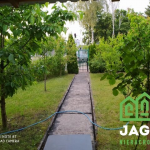 Na działce - drzewka owocowe, trawa, iglaki