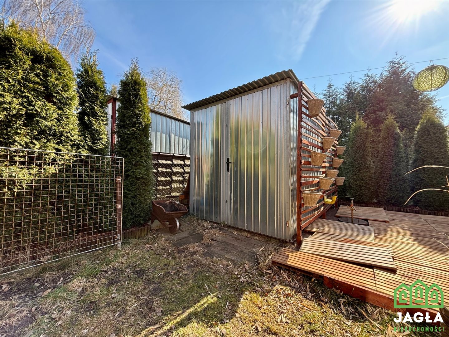 Teren jest bardzo starannie zagospodarowany - liczne nasadzenia, żywopłot zapewniający prywatność oraz uporządkowana przestrzeń tworzą przyjemny mikroklimat do wypoczynku. Na działce znajdują się także garaż blaszany oraz drewniany domek narzędziowy, dzięki którym bez problemu przechowasz sprzęt ogrodowy czy rowery.
