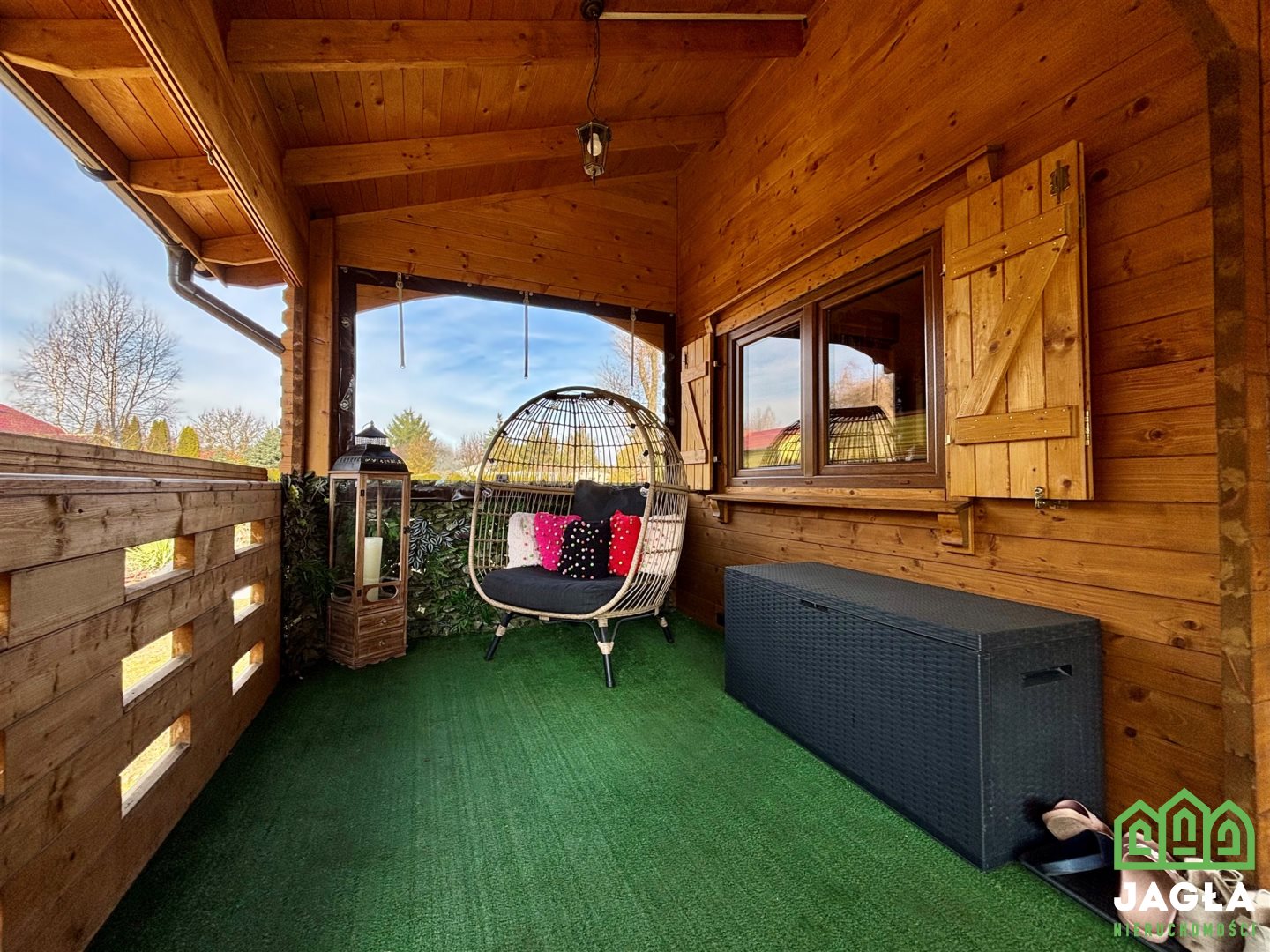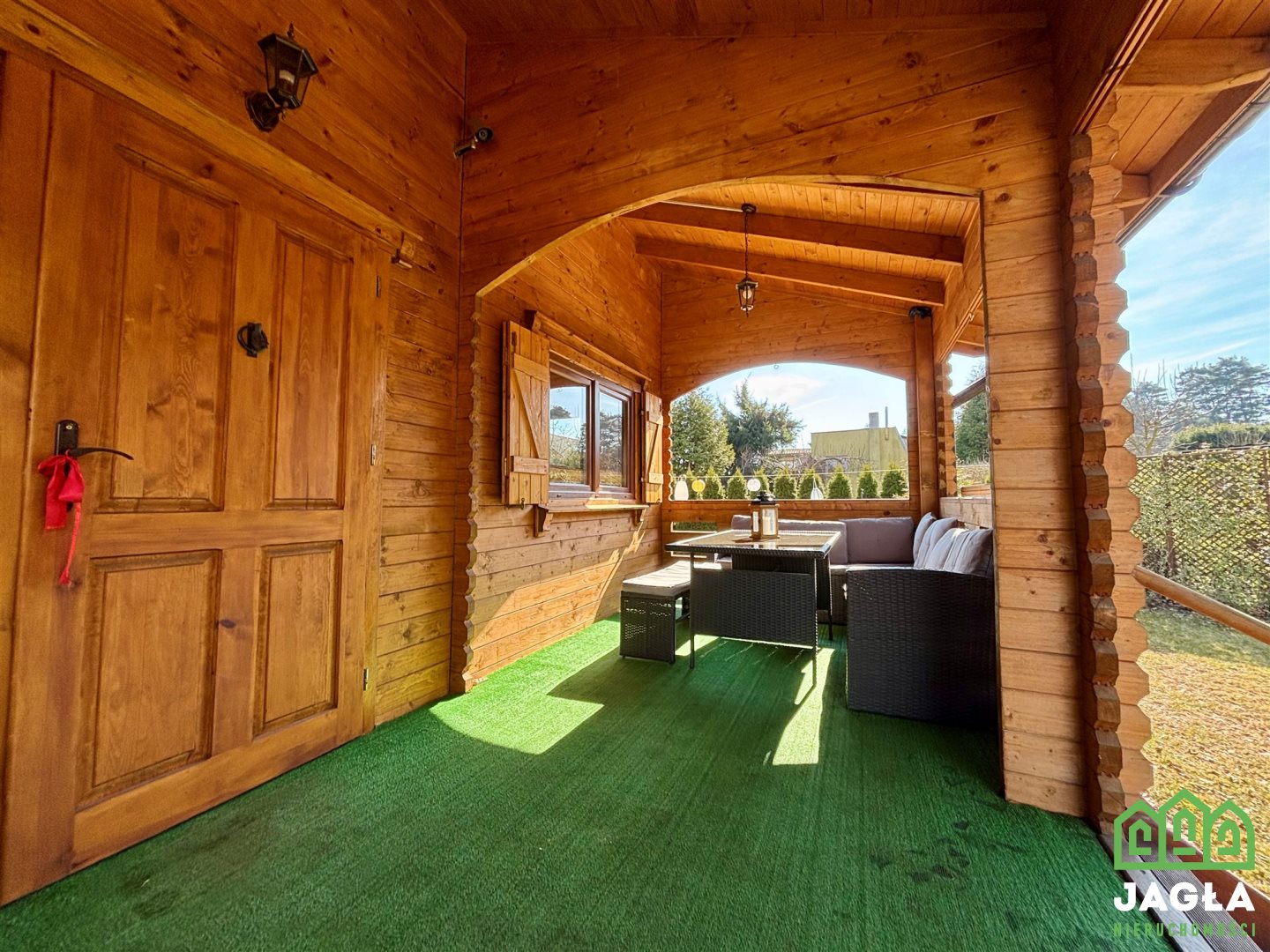 - zadaszony taras przy domku, idealny na poranną kawę oraz wieczory wypoczynek